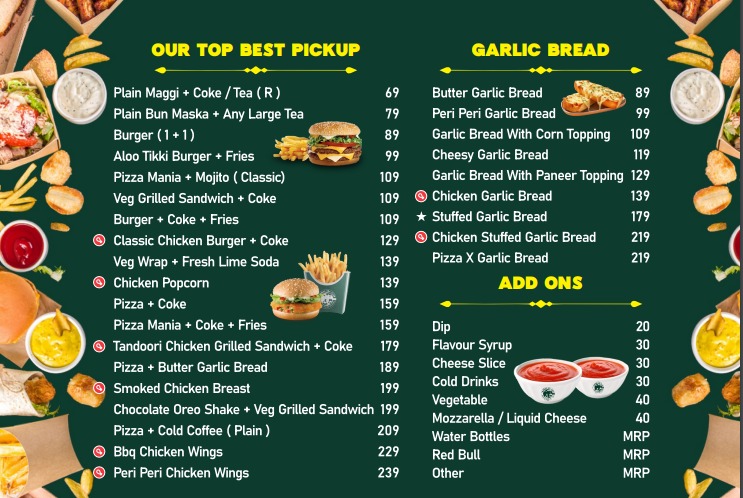 veg pizza+ pasta+butter garlic bread +Fries + Kurkure momos+ Chai/ cold Drink